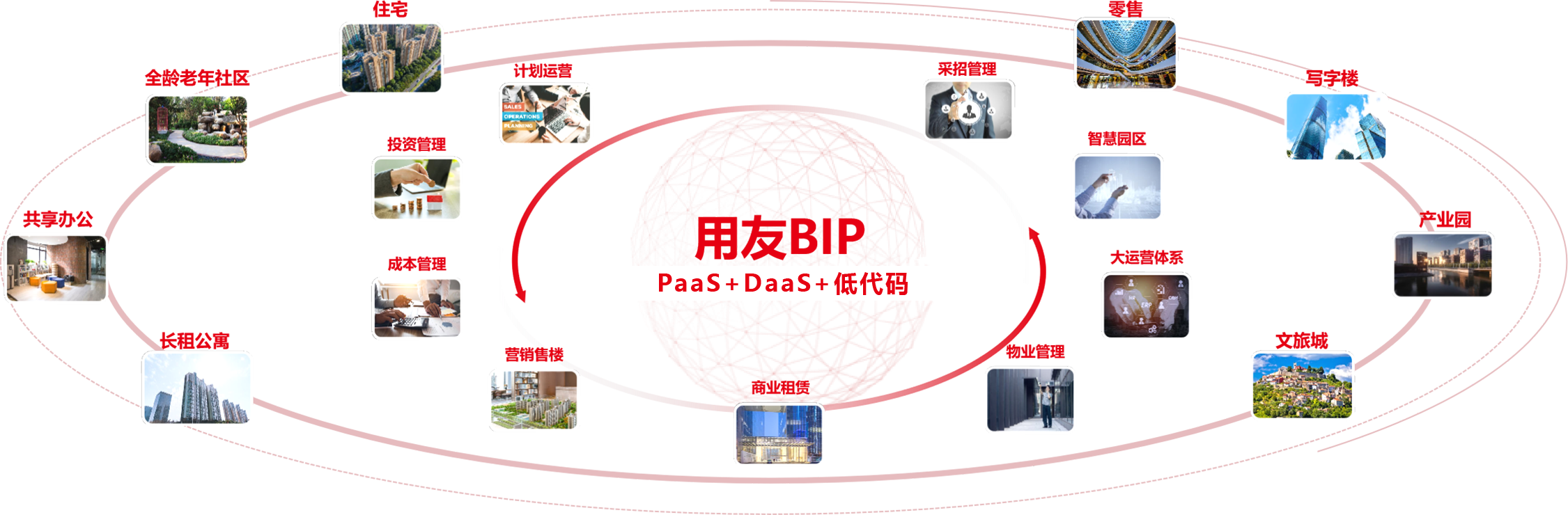 建立地产企业云服务入口,基于业务中台、数据中台、 智能中台、统一技术平台的企业应用服务SaaS,以低代码平台快速满足个性化需求,以流程自动化工具,将地产企业的业务和平台深度融合