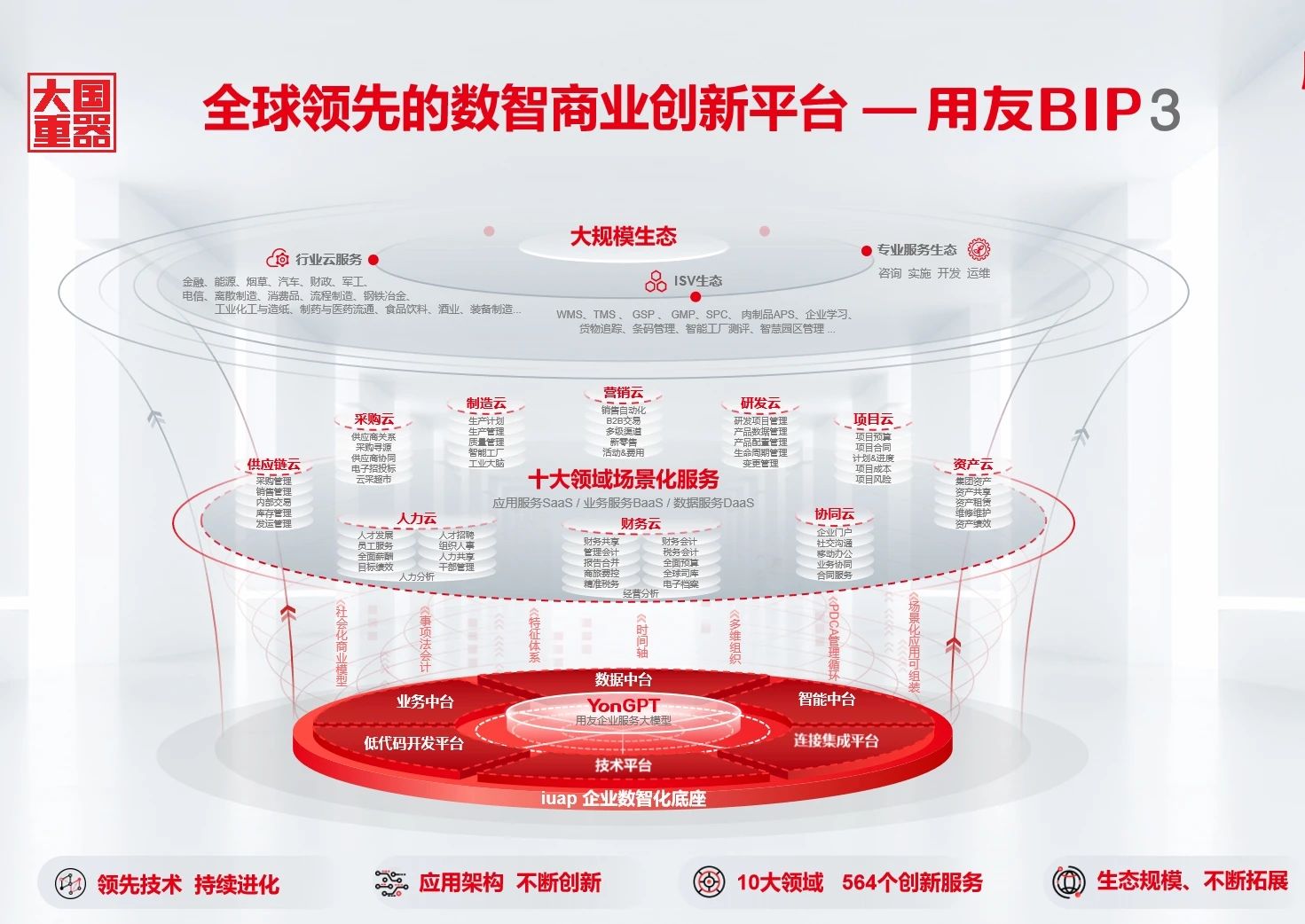 坚持科技创新引领,是当前我国经济发展的主旋律。今年的两会政府报告,明确把“新质生产力”列为2024年工作任务之首。新质生产力代表生产力的跃迁,主要特征是高科技、高效能、高质量,实现路径就是数字化和智能化。 数年前,用友在业界率先提出了“企业数智化”(数字化+智能化)、“数智企业”的概念。用友认为,在数智化时代,全球企业的发展正在走向一个新的范式,即“数智企业”。客户导向、生态共荣、员工能动、实时感知、数据驱动、智能运营是数智企业应当具备的六大特性。 企业加速数智化转型,成为“数智企业”,是迈向高质量发展的必由之路。数智企业作为新质生产力的典型代表与核心动力,正在千行百业加速落地。 成为“数智企业”,离不开背后软件服务厂商和数智技术的支撑。中国软件产业经历了电脑化阶段落后于西方、信息化阶段追赶发达国家,如今进入数智化阶段后,开始走在全球前列。 针对企业数智化创新发展的需要,用友战略研发打造的全新一代产品—用友BIP(用友商业创新平台),通过数智底座以及财务、人力、供应链、营销、采购、制造、研发、项目、资产、协同等数智化服务,推动企业数智化由浅入深、由点及面进阶升级,引领企业加速进入数智化时代,成就数智企业。 02 成就数智企业 助力企业实现业务敏捷