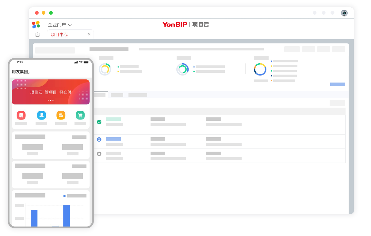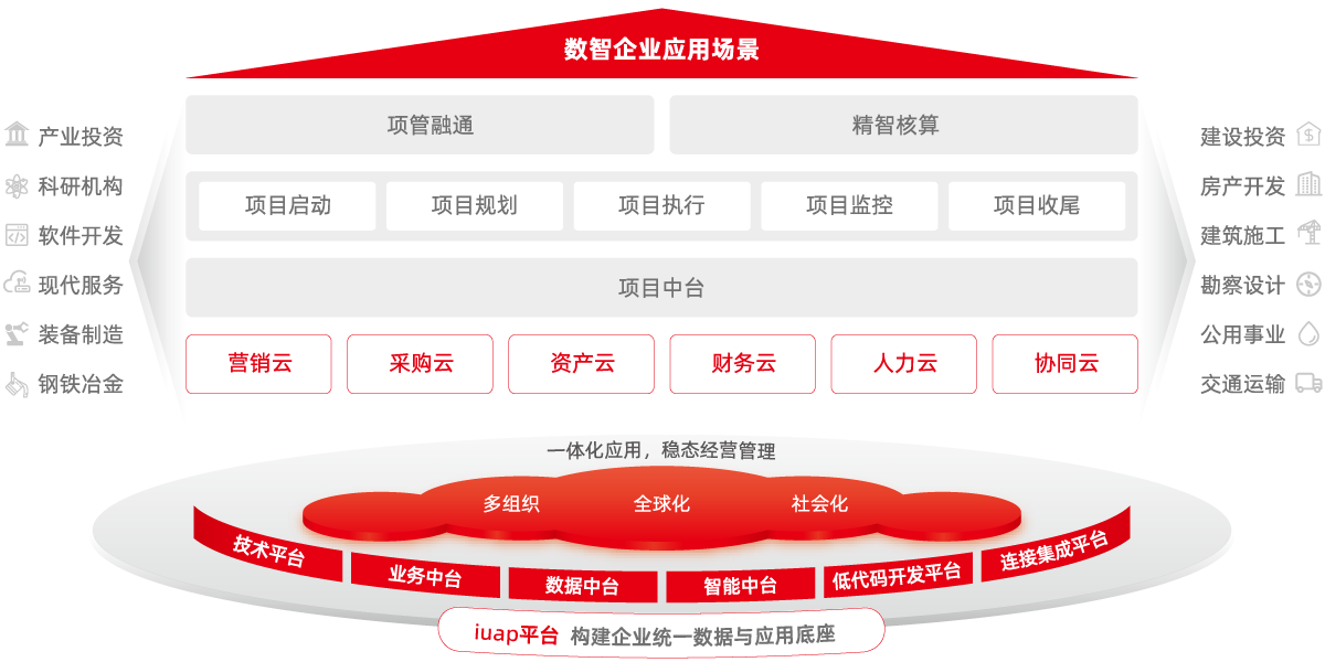 用友项目云面向项目型组织,通过标准的项目管理业务中台能力和开放性连接能力,实现多业态、多场景的项目管理与企业 管理场景相融合,支撑项目型组织基于业财融合、产业互联、数据驱动的全生命周期管理与全要素、全成本的精细项目核算, 提升企业的综合项目管理能力和经营能力。
