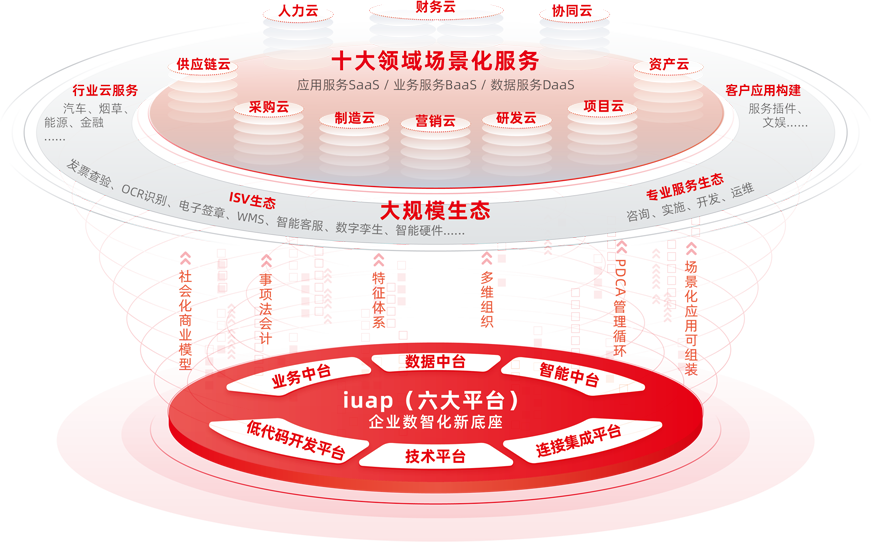 YonBIP设计和实现了云原生、元数据驱动、中台化、数用分离的新一代技术架构,将各种数智化技术与创新需求融合,让商业创新更便捷;同时基于社会化商业、事项法会计、特征体系、多维组织等应用架构,支持社会级数字化建模,支撑财务、人力、供应链等领域构建更精细多维、弹性扩展的业务场景。